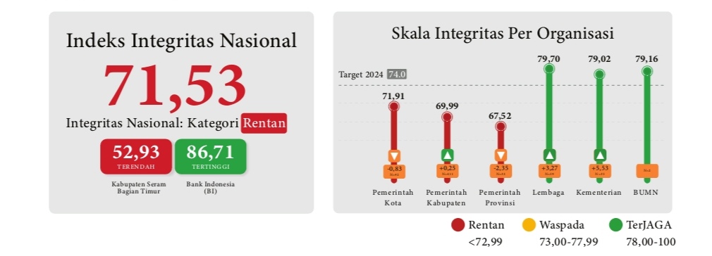 JAKARTA, IndoBisnis – Indeks Integritas Nasional memberikan gambaran umum tingkat integritas di seluruh Indonesia. Pada tahun 2024, Indeks Integritas Nasional berada di angka 71,53. Nilai ini mengalami kenaikan 0,56 poin dari tahun sebelumnya. Meski naik, raihan angka tersebut masih belum mampu mendongkrak. predikat kategori nasional keluar dari kelompok rentan. Dengan kata lain, risiko korupsi sangat potensial muncul di lingkup organisasi pemerintahan.