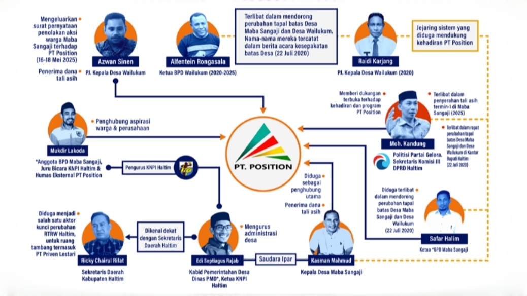 Jejak korporasi dalam konflik ini kian jelas. PT Position disebut memiliki hubungan erat dengan jaringan birokrat dan elit politik lokal yang terlibat dalam Pilkada. Nama Edi Septiagus Rajab, Kepala Bidang Pemerintahan Desa di Dinas PMD Halmahera Timur sekaligus Ketua KNPI setempat, muncul sebagai penghubung utama antara perusahaan dan birokrasi.